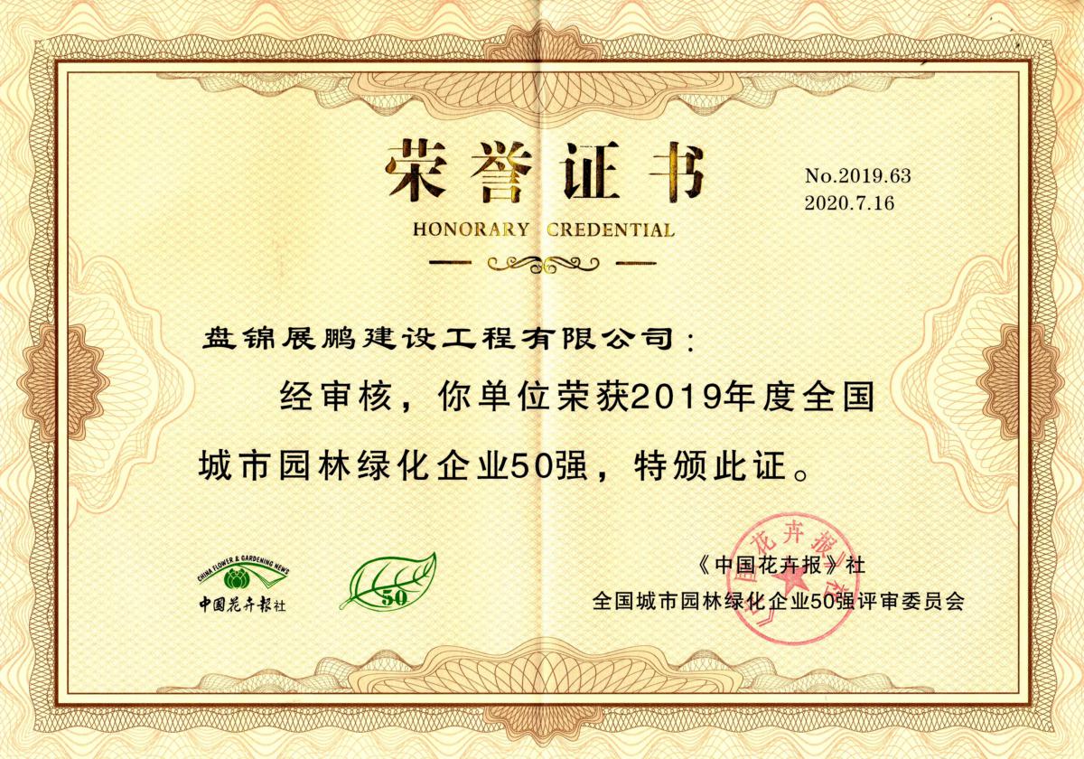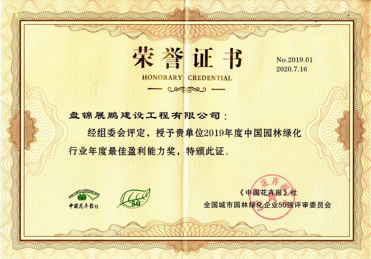 2020年10月17日,2019年度全國城市園林綠化50強頒獎儀式在山東省泰安市舉行。盤錦展鵬建設工程有限公司憑借2019年58.68%的凈資產收益率獲獎“年度最佳盈利能力獎”,排名第一。